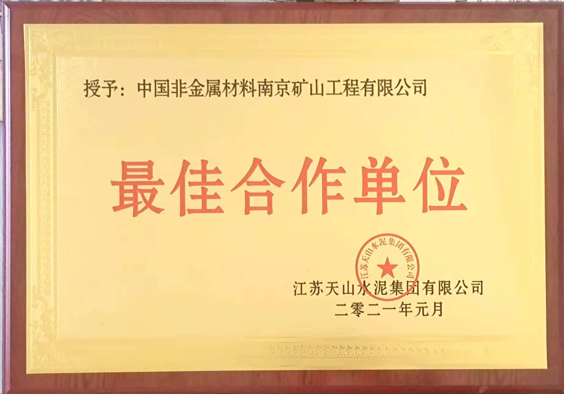 2021年1月8日在溧水天山水泥有限公司2020年度總結(jié)表彰大會(huì)上,溧水分公司受到江蘇天山水泥集團(tuán)表彰,并授予“最佳合作單位”稱號(hào)。
