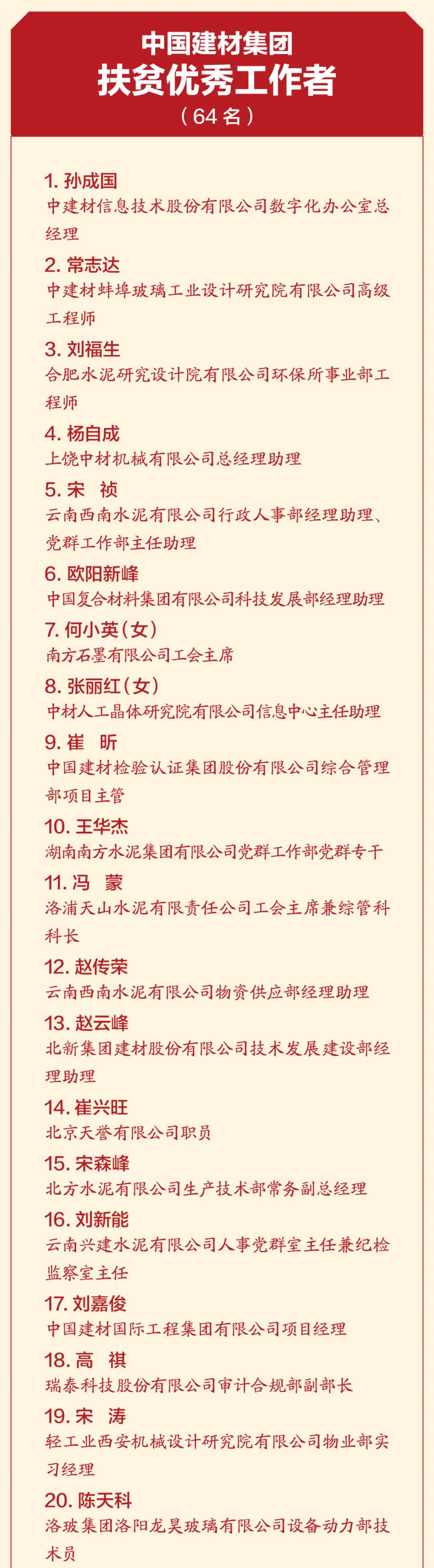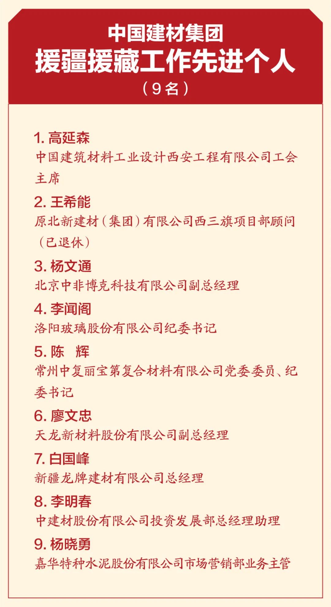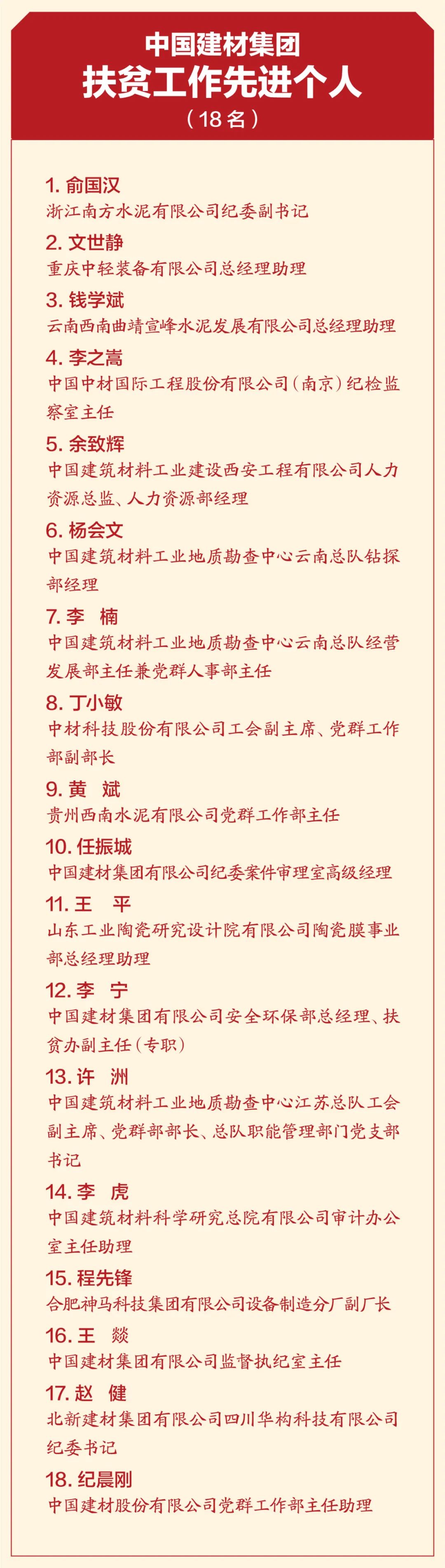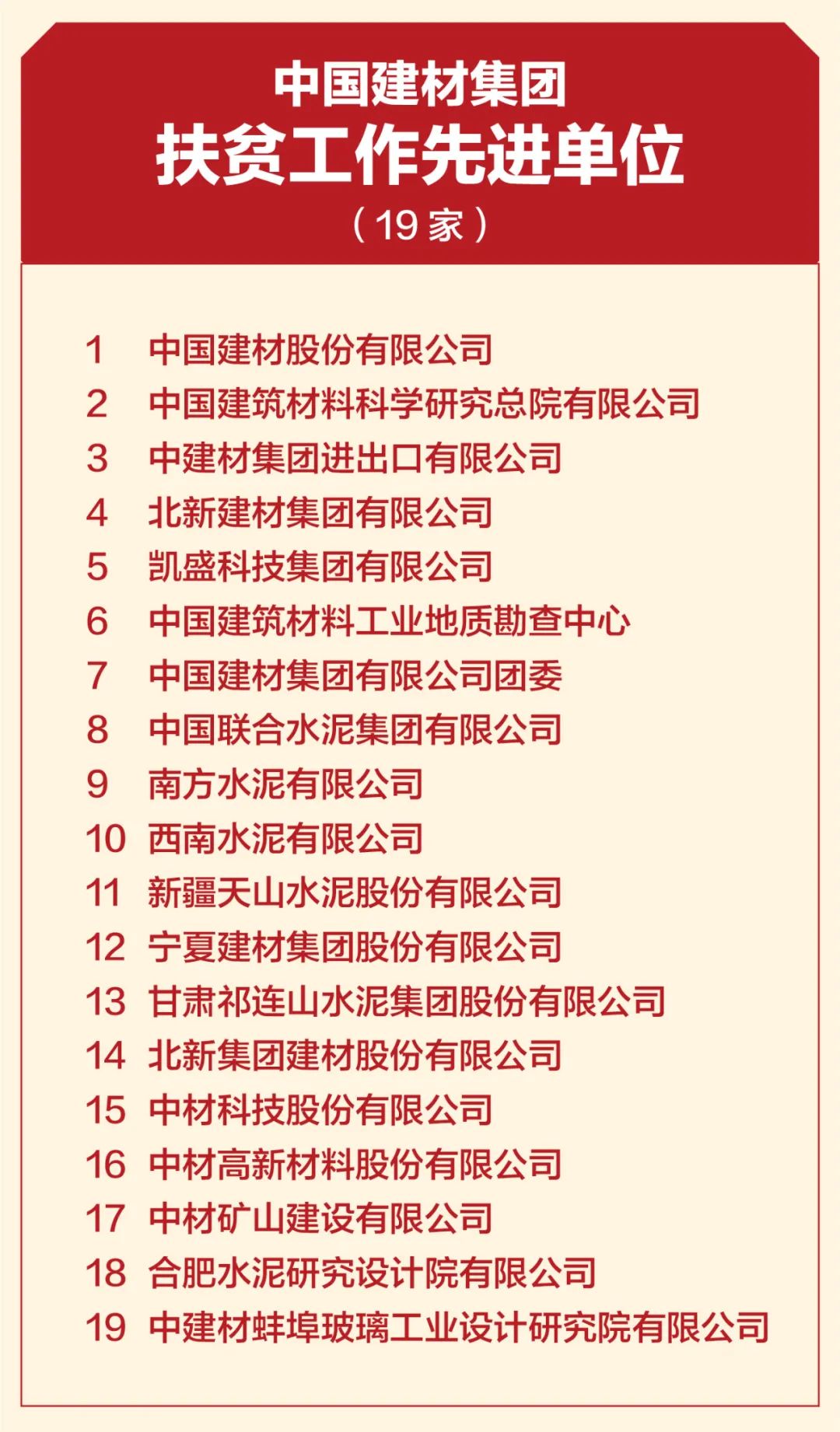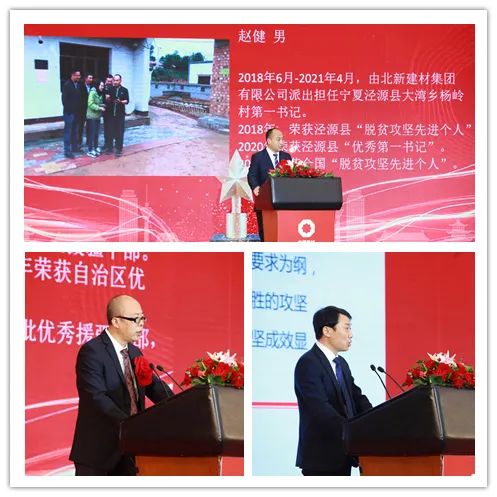 4月19日,中國建材集團扶貧工作暨援疆援藏工作表彰大會在京召開,會議深入學習貫徹習近平總書記重要講話精神,特別是習近平總書記關于扶貧工作的系列重要論述,全面總結集團扶貧工作及援疆援藏工作任務完成情況,表彰集團在扶貧工作和援疆援藏工作中涌現(xiàn)出來的先進個人和集體,并就接續(xù)鄉(xiāng)村振興做好下一階段工作做出安排部署。 中國建材集團扶貧工作紀實片 國資委科技創(chuàng)新和社會責任局副局長張曉紅出席會議并致辭,國家鄉(xiāng)村振興局社會扶貧司定點扶貧處處長周曉云,中國志愿服務基金會副理事長兼秘書長姚桂清出席會議。集團黨委書記、董事長周育先發(fā)表重要講話,集團黨委副書記、董事、總經(jīng)理曹江林宣讀表彰決定。集團黨委常委、副董事長李新華,黨委副書記孫力實,黨委常委、總會計師詹艷景,黨委常委、紀委書記楊杰,黨委常委、副總經(jīng)理王于猛、魏如山出席會議。 國資委科技創(chuàng)新和社會責任局副局長張曉紅 張曉紅在致辭中對中國建材隆重召開扶貧工作暨援疆援藏工作表彰大會表示祝賀!對中國建材在脫貧攻堅、援疆援藏工作中取得的成績表示肯定!她指出:中國建材舉全集團之力,盡銳出戰(zhàn),傾心幫扶,在扶貧工作和援疆援藏工作中體現(xiàn)出了“政治站位高、幫扶措施實、干部作風硬、脫貧成效好”四個鮮明特點。希望中國建材繼續(xù)做好鞏固拓展脫貧攻堅成果同鄉(xiāng)村振興有效銜接,充分發(fā)揮中國建材的綜合優(yōu)勢,在落實鄉(xiāng)村振興戰(zhàn)略、助力農(nóng)村高質量發(fā)展中作出新貢獻,取得新成績。 中國建材集團黨委書記、董事長周育先 周育先在講話中重申了扶貧工作與援疆援藏工作的重要意義。打贏脫貧攻堅戰(zhàn),是全面建成小康社會最艱巨的任務,是以習近平同志為核心的黨中央向國內(nèi)外做出的莊嚴承諾。援疆援藏工作是貫徹新時代黨的治疆治藏方略的工作要求。中國建材始終堅持聽黨話、跟黨走,不忘初心、牢記使命、勇?lián)熑?,堅決貫徹落實黨中央、國務院和上級有關單位關于脫貧攻堅、援疆援藏工作的各項部署要求。 周育先在講話中從四個方面回顧了中國建材的扶貧工作和援疆援藏工作。一是堅持黨的領導,提高政治站位,強化組織保證。二是突出精準施策,注重因地制宜,提高脫貧實效。三是創(chuàng)新幫扶模式,善用平臺資源,凝聚各方力量。四是嚴格干部選派,加強作風建設,踐行初心使命。他指出:中國建材能取得這樣的成績,根本在于黨的堅強領導、在于全方位精準施策、在于發(fā)揮好自身優(yōu)勢、在于凝聚起各方力量。在投身脫貧攻堅過程中:我們堅決落實以習近平同志為核心的黨中央決策部署,深入學習貫徹習近平新時代中國特色社會主義思想特別是習近平總書記關于扶貧工作的系列重要論述;我們認真落實以人民為中心的發(fā)展思想,堅決把精準扶貧方略落到實處,真扶貧、扶真貧;我們統(tǒng)籌推進企業(yè)發(fā)展與幫扶工作,精準實施六大幫扶措施;我們充分調動干部員工積極性和主動性,舉全集團之力,盡銳出戰(zhàn);我們與幫扶地區(qū)干部群眾同想同干,共謀發(fā)展。在扶貧工作和援疆援藏工作這場大戰(zhàn)大考中戰(zhàn)出了精氣神、考出了好成績。 脫貧摘帽不是終點,而是新生活、新奮斗的起點。2021年是十四五的開局之年,是全面實施鄉(xiāng)村振興戰(zhàn)略的起步階段。周育先要求:要以落實中央各項決策部署為根本,落實中央關于鄉(xiāng)村振興、援疆援藏的工作要求;落實集團幫扶政策,圍繞六大幫扶措施進行統(tǒng)籌安排;關心關愛幫扶干部,支持他們的工作,使幫扶干部心無旁騖的投入鄉(xiāng)村振興工作。要以黨史學習教育為契機,學史明理、學史增信、學史崇德、學史力行,不忘共產(chǎn)黨人的初心使命,大力弘揚脫貧攻堅精神,團結一心,英勇奮斗,與定點幫扶地區(qū)一起做好鞏固拓展脫貧攻堅成果與鄉(xiāng)村振興有效銜接工作,乘勢而上,再接再厲,接續(xù)奮斗,以優(yōu)異成績獻禮建黨百年! 中國建材集團黨委副書記、董事、總經(jīng)理曹江林 曹江林宣讀表彰決定,黨的十八大以來,集團積極響應習近平總書記號召,認真貫徹落實黨中央、國務院和上級有關單位關于脫貧攻堅決策部署,集全集團之力,盡銳出戰(zhàn)、合力攻堅。2020年我國脫貧攻堅戰(zhàn)取得了全面勝利,區(qū)域性整體貧困得到解決,完成了消除絕對貧困的艱巨任務。集團定點幫扶的五個縣區(qū)已脫貧出列,援疆援藏工作也取得了階段性成果。為表彰在脫貧攻堅及援疆援藏工作中涌現(xiàn)出的先進個人和先進集體,充分展現(xiàn)脫貧攻堅成效成果,經(jīng)集團黨委研究決定:授予中國建材股份有限公司等19家成員企業(yè)“扶貧工作先進單位”稱號,授予俞國漢等18名同志“扶貧工作先進個人”稱號,授予高延森等9名同志“援疆援藏工作先進個人”稱號,授予孫成國等64名同志“扶貧優(yōu)秀工作者”稱號。 永善縣委書記戈昌武 石臺縣委書記李軍 永善縣委書記戈昌武代表定點幫扶縣區(qū)發(fā)言,石臺縣委書記李軍宣布:為感謝中國建材對石臺縣的幫扶,石臺縣誠摯邀請中國建材員工來石臺旅游觀光。 趙健、白國峰、高鵬濤分別發(fā)言 寧夏涇源縣大灣鄉(xiāng)楊嶺村第一書記趙健、第九批中央企業(yè